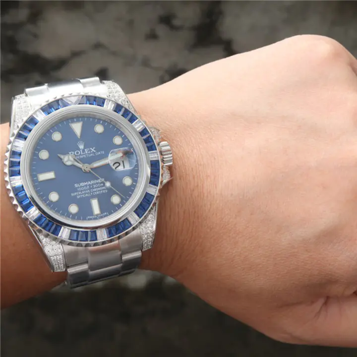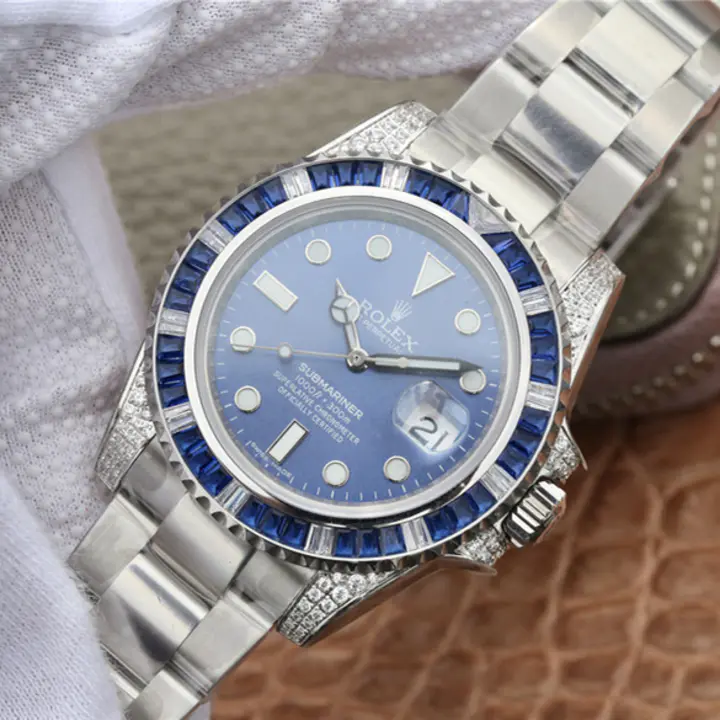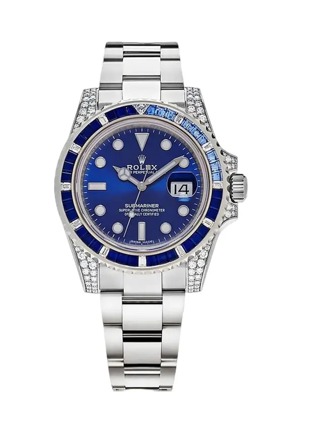This is an 18K white gold Rolex Submariner 116659SABR. t includes an integral Rolex 18K white gold Oysterlock bracelet with a folding deployment clasp and a scratch resistant sapphire crystal. It has a screwed down solid case back and Triplock winding crown protected by diamond set crown guards. The solid three-body 40 mm. diameter case, straight diamond set lugs, bracelet and flat knurled bezel, are polished and brushed. The graduated unidirectional revolving bezel is white gold and set with 27 b aguette cut sapphires, and 11 baguette cut diamonds every 10 minutes, the dive triangle at the 60-minute position is set with a triangular diamond. It has a sunburst blue dial with luminous white gold-set dot, baton, and arrow hour index markers, luminous white gold "Mercedes" style Rolex minute and hour hands, a center sweep second hand with a luminous "lollipop" indicator, a white minute/second perimeter chapter ring, and a cyclops magnification lens for the date aperture window at 3 o'clock. It's water resistant to 330 meter/1,000 feet, it has a 48-hour power reserve at full winding, and the 13mm thick case, dial, and movement are all signed.