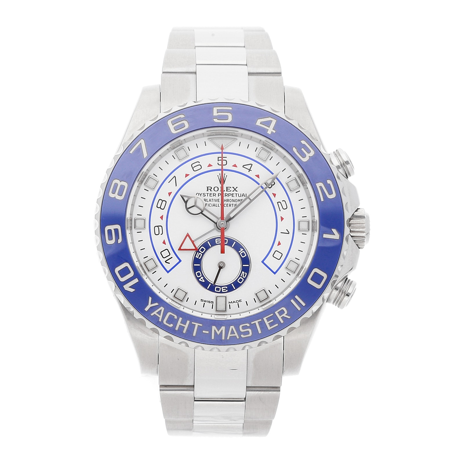 Coming soon! This item will be available to ship in 3-6 weeks. Photo is representative-only.Pre-Owned Rolex Yacht-Master II (116680) self - winding automatic watch, features a 44mm stainless steel case with a blue Cerachrom bezel surrounding a white dial on a stainless steel Oyster bracelet with folding buckle. Functions include hours, minutes, small seconds, chronograph and countdown timer.This watch comes with papers. Scattered Serial.Time remaining on the factory warranty!