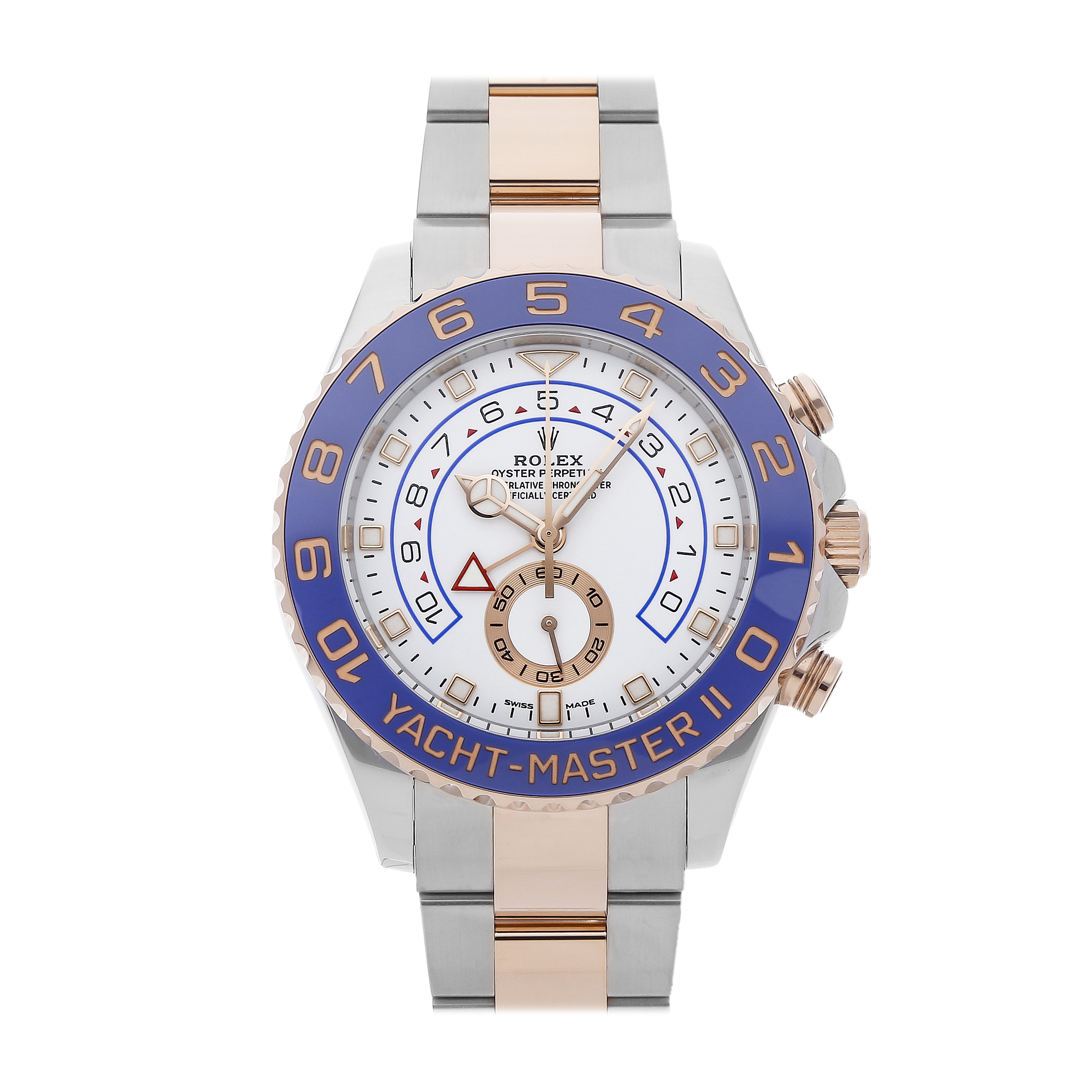 Pre-Owned Rolex Yacht-Master II (116681) self-winding automatic watch, features a 44mm stainless steel case with an 18k Everose gold and blue Cerachrom bezel surrounding a white dial on a stainless steel and 18k Everose gold Oyster bracelet with folding buckle. Functions include hours, minutes, small seconds, chronograph and regatta timer. This watch does not come with box or papers. Scattered Serial.We back this watch with a 2-Year WatchBox warranty!