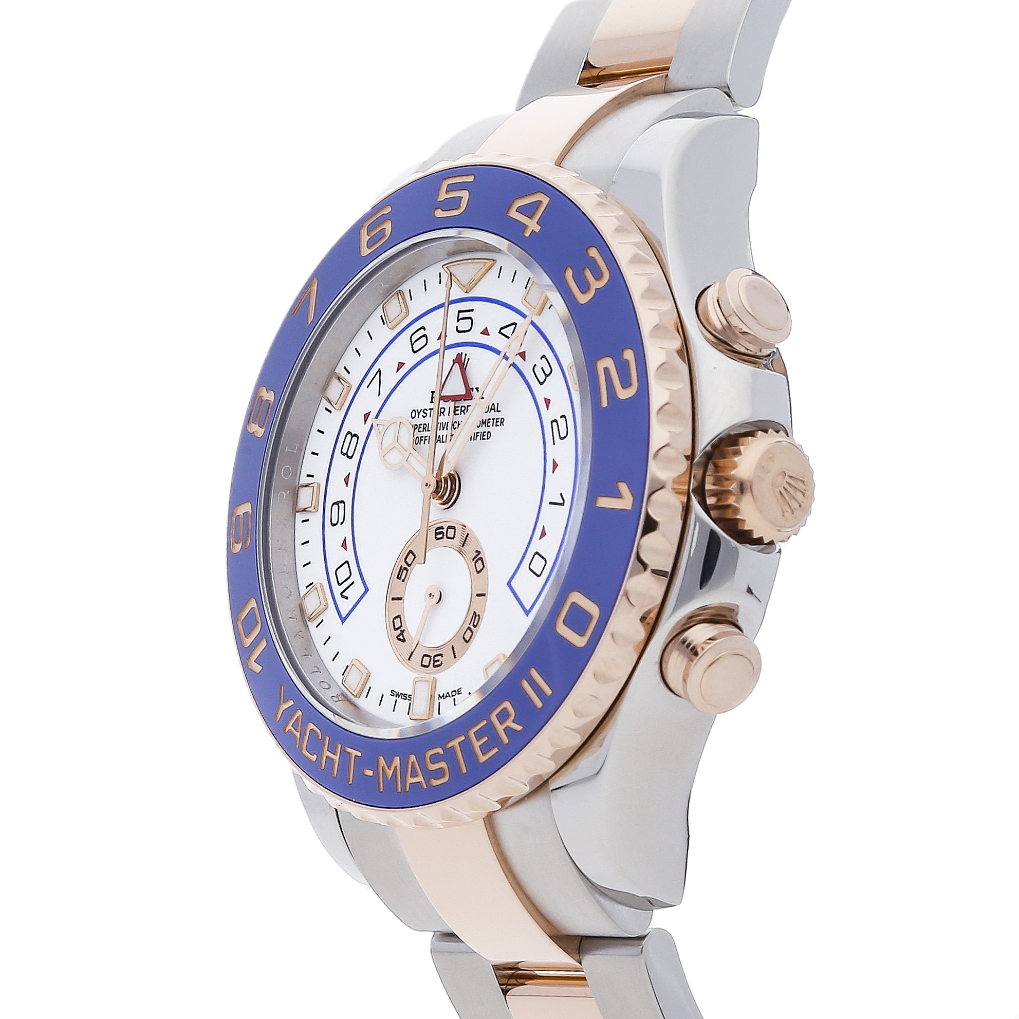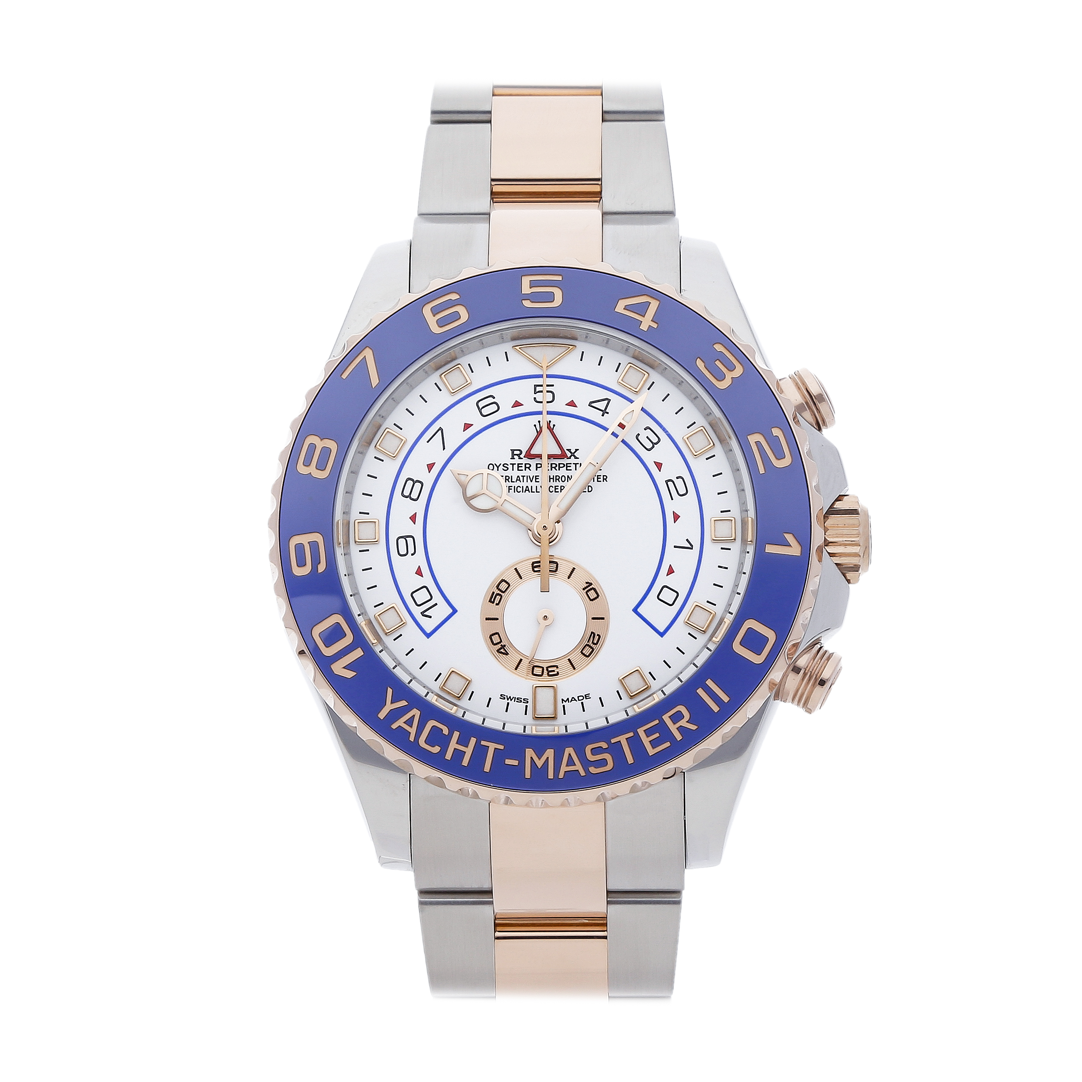 Pre-Owned Rolex Yacht-Master II (116681) self - winding automatic watch, features a 44mm stainless steel case with an 18k Everose gold and blue Cerachrom bezel surrounding a white dial on a stainless steel and Everose gold Oyster bracelet with folding buckle. Functions include hours, minutes, small seconds and regatta timer. This watch does not come with box or papers. Scattered Serial.We back this watch with a 2-Year WatchBox warranty!